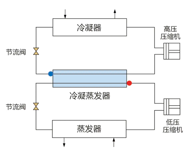 如果你想要获得-60℃以下的低温,采用单一制冷剂的多级压缩已经难以实现,此时我们可以采用复叠式制冷系统。复叠式冷水机采用多套不同制冷循环系统进行“接力”,通过高温级和低温级系统协同工作来实现低温效果。复叠式制冷系统相对简单可靠,同时系统适应性强,能够通过调整级数或制冷剂来匹配不同温度需求。系统中的分压设计更是减少了压缩比的限制,延长了设备寿命。