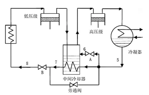 两级压缩式冷水机通过两个不同压力级别的压缩机去压缩同一种制冷剂,从而逐步提升压力、降低温度,逐步实现深度制冷。制冷剂气体先在低压级压缩机中被压缩,经中冷器冷却后,再进入高压级压缩机进一步压缩。该系统成本比复叠式制冷系统要低,但其低温极限是有限的,一般用于-60℃以上的场所。
