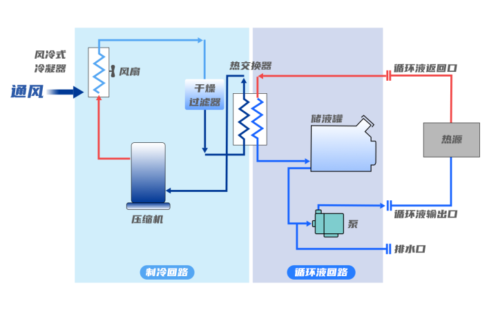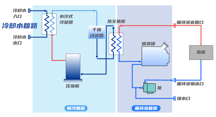 除了冷却方式外,我们还可以根据工作温度对压缩机式冷水机进行分类:首先,以0℃为分界点可以分为常温型和低温型冷水机。低温型冷水机根据不同制冷原理又可以分为两级压缩式制冷和复叠式制冷冷水机。当我们需要获取-60℃以上的低温时,可以采用两级压缩制冷循环;而当我们获取-60℃以下低温时,必须采用复叠式制冷循环。下面是这几类冷水机的工作原理和详细介绍。