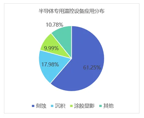 据统计,在所有半导体温控设备应用场景中,前三大核心工艺环节是刻蚀、薄膜沉积和涂胶显影,这三个环节分别占比61.25%、17.98%和9.99%,合计占据了总应用的90%。