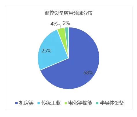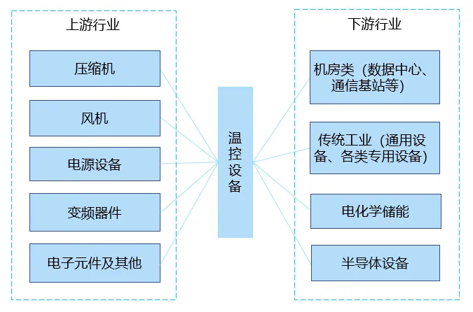 温控设备产业链上游主要为核心零部件,包括压缩机、风机、电源设备、变频器件、其他电子元件等,上游厂商较为零散。中游主要为温控设备,可分为风冷和液冷两大制冷模式,其中风冷温控设备是通过空气流动带走热量,使设备表面温度降低;液冷温控设备(俗称冷水机)是通过液体循环带走热量,使设备内部温度降低。下游主要分布于各行各业,如机房类温控系统(主要应用于运营商、互联网、云计算、金融等领域)、传统工业温控系统(主要应用于通用设备、数控机床、激光设备等)、电化学储能设备以及半导体设备等。