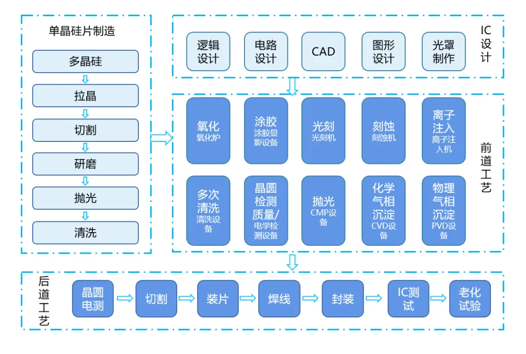 半导体制造工艺主要分为两大类:前道工艺(晶圆制造)和后道工艺(封装与测试)。前道工艺涉及硅片加工、光刻、刻蚀、离子注入、薄膜沉积、清洗、抛光、金属化等环节,对应的核心设备包括硅片加工设备、光刻设备、刻蚀设备、清洗设备、离子注入设备、薄膜沉积设备、机械抛光设备、量测设备等。后道工艺涉及封装设备和测试设备。