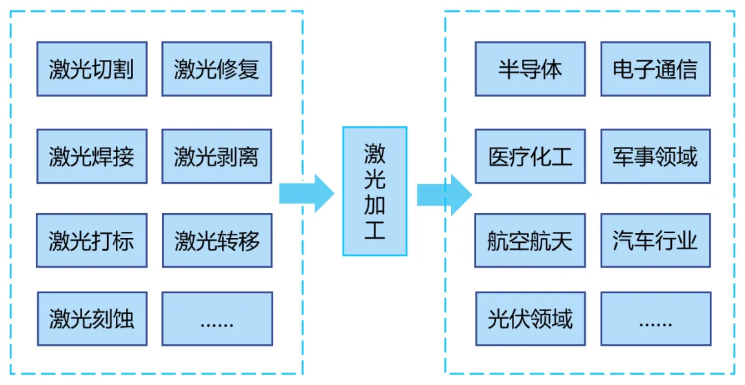 激光器主要用于激光切割、激光焊接、激光打标、激光刻蚀、激光修复、激光剥离、激光转移等精密及超精密加工技术,被广泛应用于半导体、电子、通信、军事、光伏、汽车、医疗等领域。