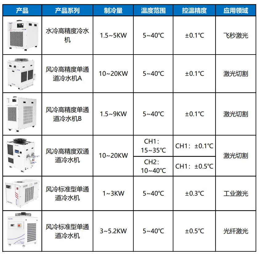 在激光加工过程中不同类型的激光器对温度区间以及精度的要求各不一致,FerroTec作为国际制冷行业的领军企业,已经自主研发出应用于工业激光、半导体激光、光纤激光、飞秒激光、皮秒激光等领域的激光冷水机,以下为部分产品案例: