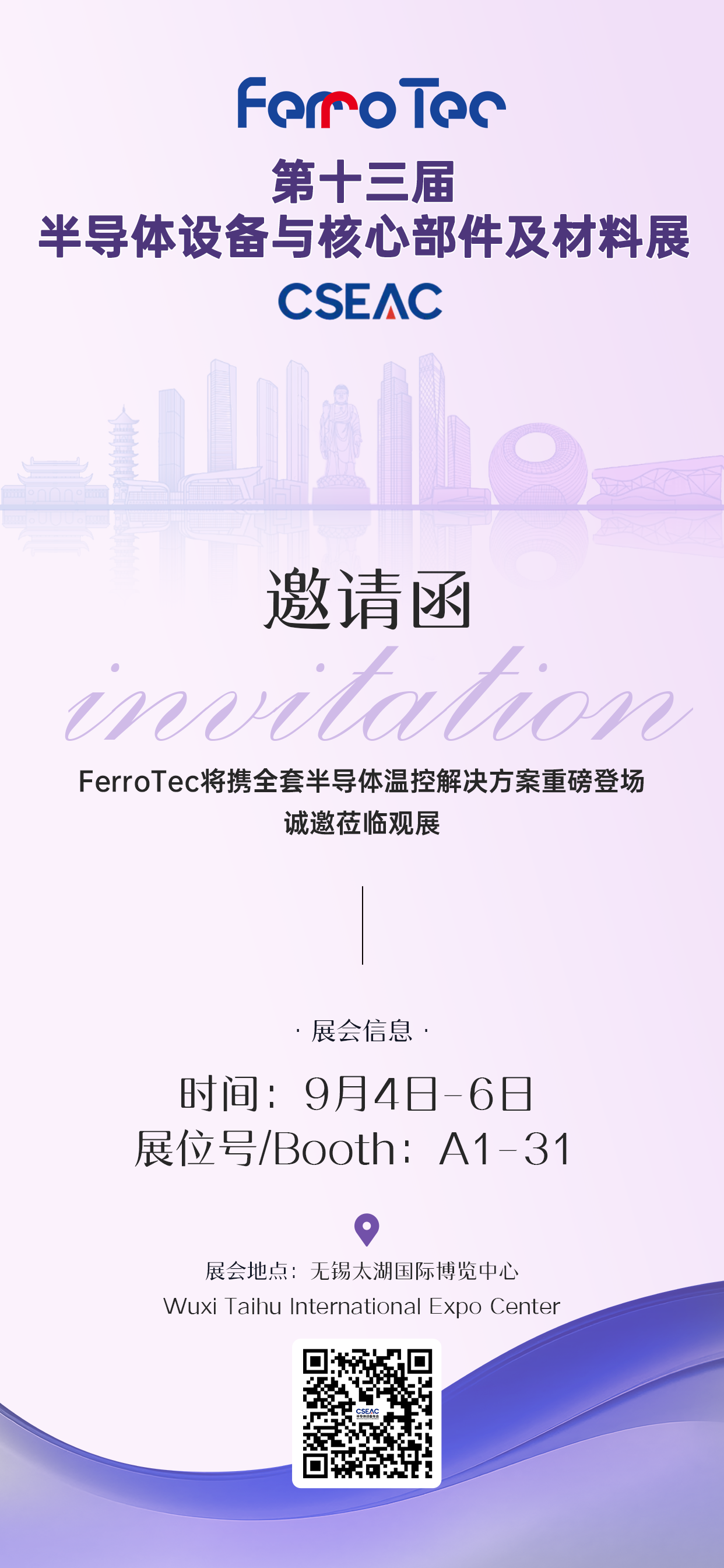 半导体行业年会——第十三届半导体设备与核心部件及材料展(CSEAC)将于9月4日至6日在无锡太湖国际博览中心盛大开幕,该展会汇聚了全球半导体产业链上下游的最新科技成果和创新应用。作为半导体热管理与核心材料技术的引领者,FerroTec将携高性能产品和热解决方案亮相本次展会。期待在A1-31展位与您相见,共同探讨半导体行业的前沿技术和未来发展趋势!