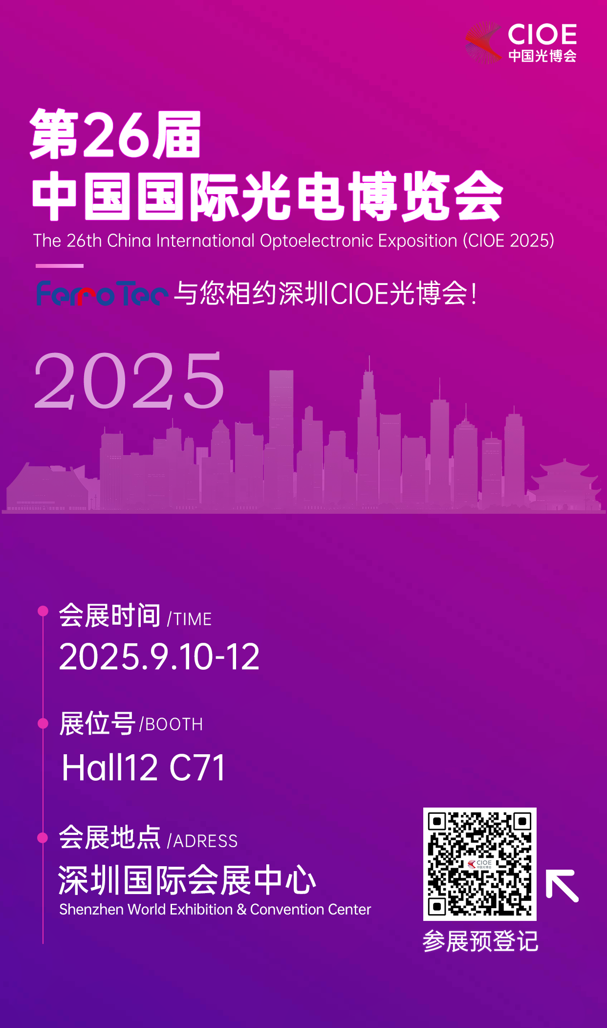 2025年9月10-12日,第二十六届中国国际光电博览会(CIOE中国光博会)将于深圳国际会展中心举办。CIOE是覆盖光电全产业链的全球性综合展会,汇聚来自30多个国家和地区的3800余家优质企业,集中展示行业前沿技术与创新成果。作为全球微型热电制冷片的领导者,届时FerroTec将携光通信领域全系列温控解决方案精彩亮相。诚邀业界同仁莅临FerroTec展台Hall12-C71,共探光通信温控趋势,共话产业未来发展!