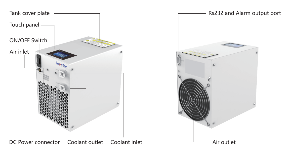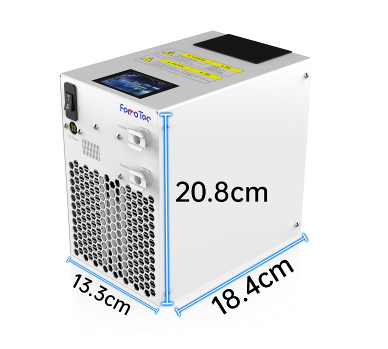 该冷水机外形小巧,尺寸仅13.3×20.8×18.4cm,能轻松放入实验台角落、设备机柜内部、医疗仪器机身等小空间场景。此外,冷水机重量较轻,方便搬运和部署,可以灵活移动到不同工位使用。