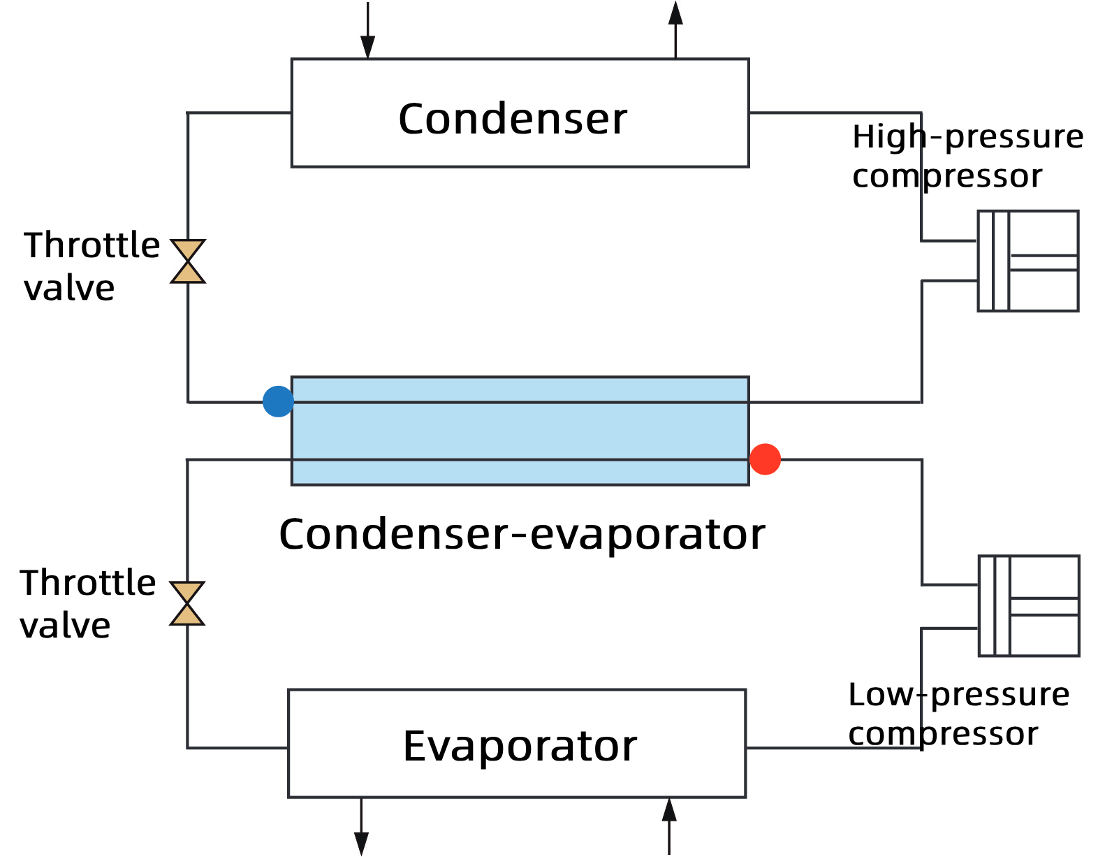 If you want to get -60 ℃ below the low temperature, using a single refrigerant multi-stage compression has been difficult to realize, at this time we can use the cascade refrigeration system. Compound chiller using a number of different refrigeration circulatory system “relay”, through the high-temperature stage and low-temperature stage system to work together to achieve low-temperature effect. Compound refrigeration system is relatively simple and reliable, at the same time, the system is adaptable, can be adjusted through the number of stages or refrigerant to match the different temperature requirements. The split-pressure design of the system reduces compression ratio limitations and extends equipment life.