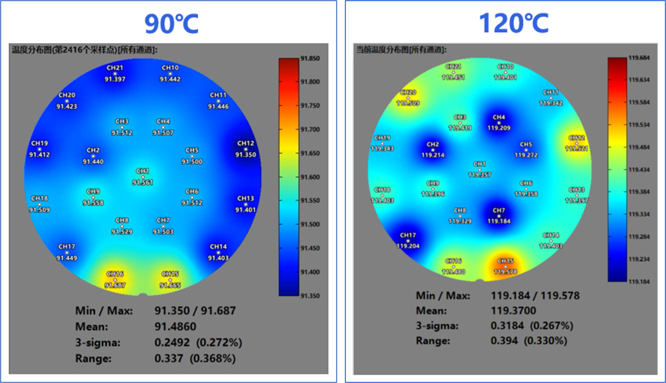 The range is 0.337℃ at 90℃ and 0.394℃ at 120℃: it meets the standard of temperature uniformity of ±0.2℃ at 50~120℃