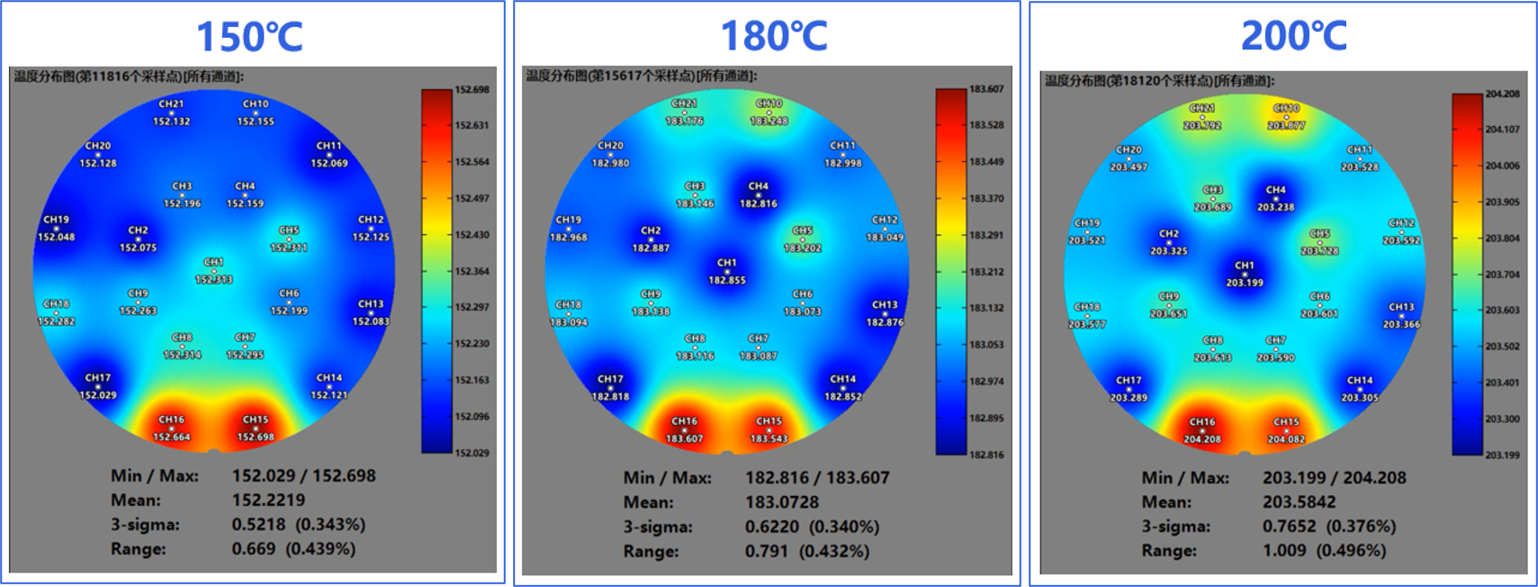 The range is 0.791℃ at 180℃ and 1.009℃ at 200℃: it meets the standard of temperature uniformity of ±0.6℃ at 150.1~200℃